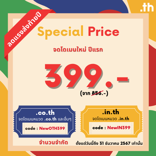 ![]() | 13 มิถุนายน 2568 Mid Year Sale ลด 50%จดทะเบียนโดเมนใหม่หรือต่ออายุโดเมนเดิม ลด 50% ทุกหมวดหมู่ |
