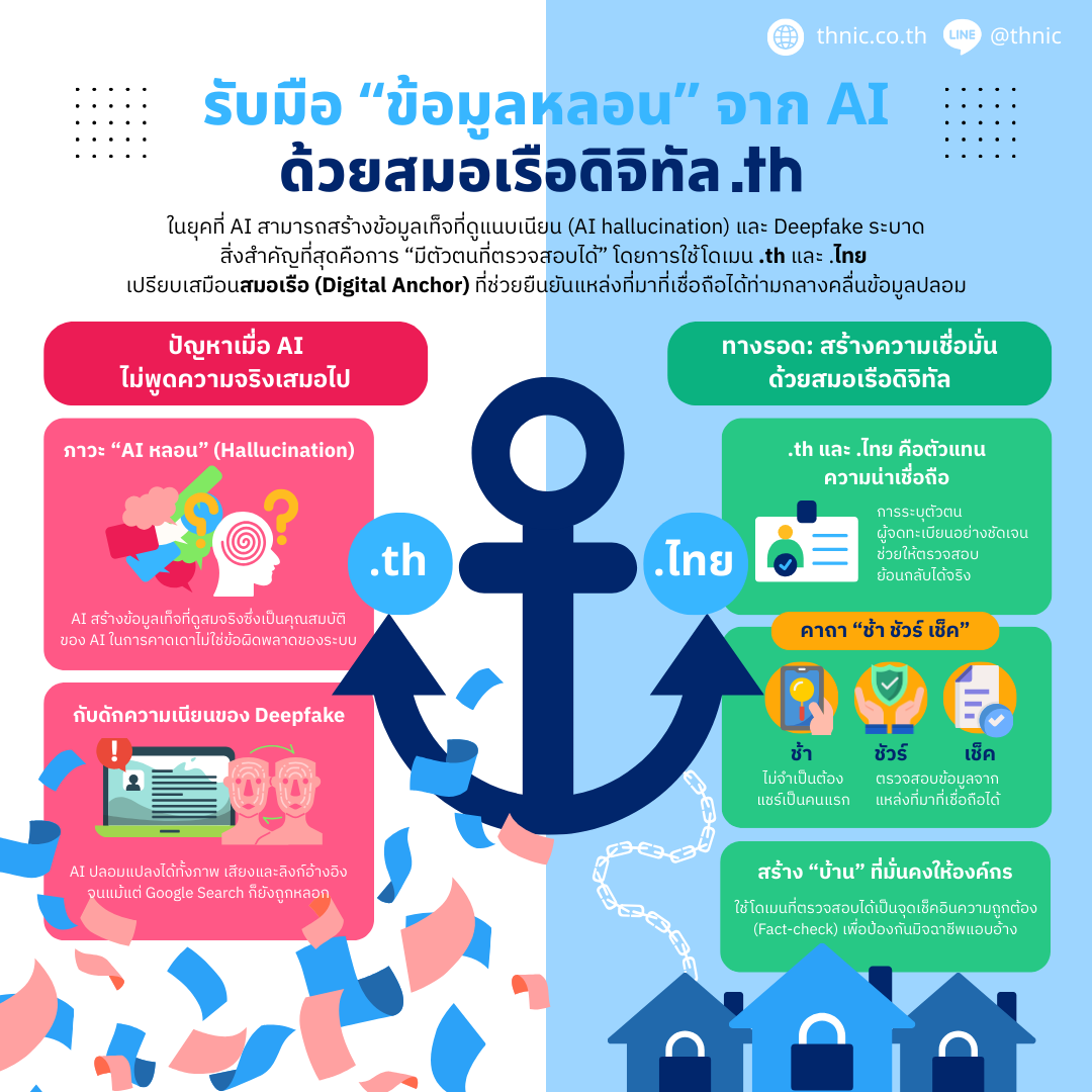 ![]() | 26 กุมภาพันธ์ 2569 เมื่อ “AI หลอน” ทางรอดจากโลก Deepfake ที่ความจริงหาได้ยากขึ้นทุกวันสรุปสาระสำคัญจากงานเสวนา "รับมือข้อมูลหลอน ถอดรหัสปัญญาประดิษฐ์ (AI)" |