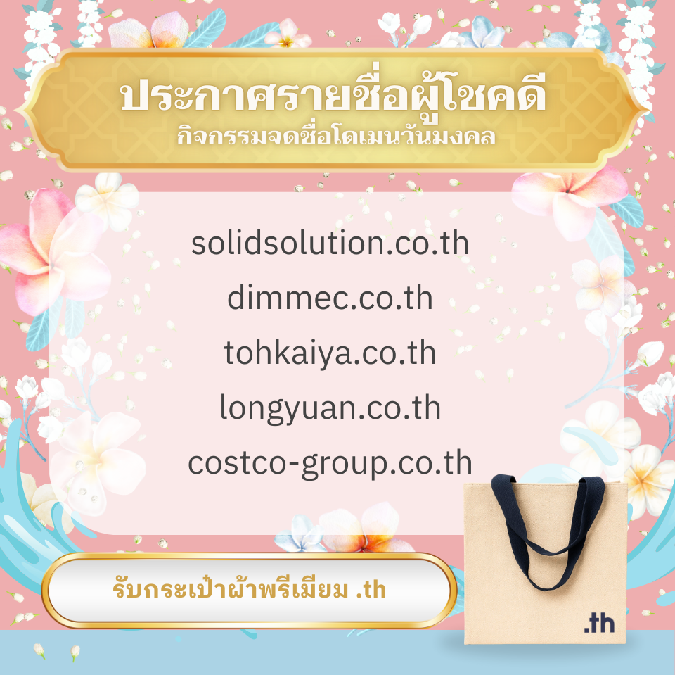 ขอแสดงความยินดีกับโดเมนที่จดทะเบียนในวันมงคล ได้รับกระเป่าผ้าพรีเมียม .th จำนวน 5 โดเมน